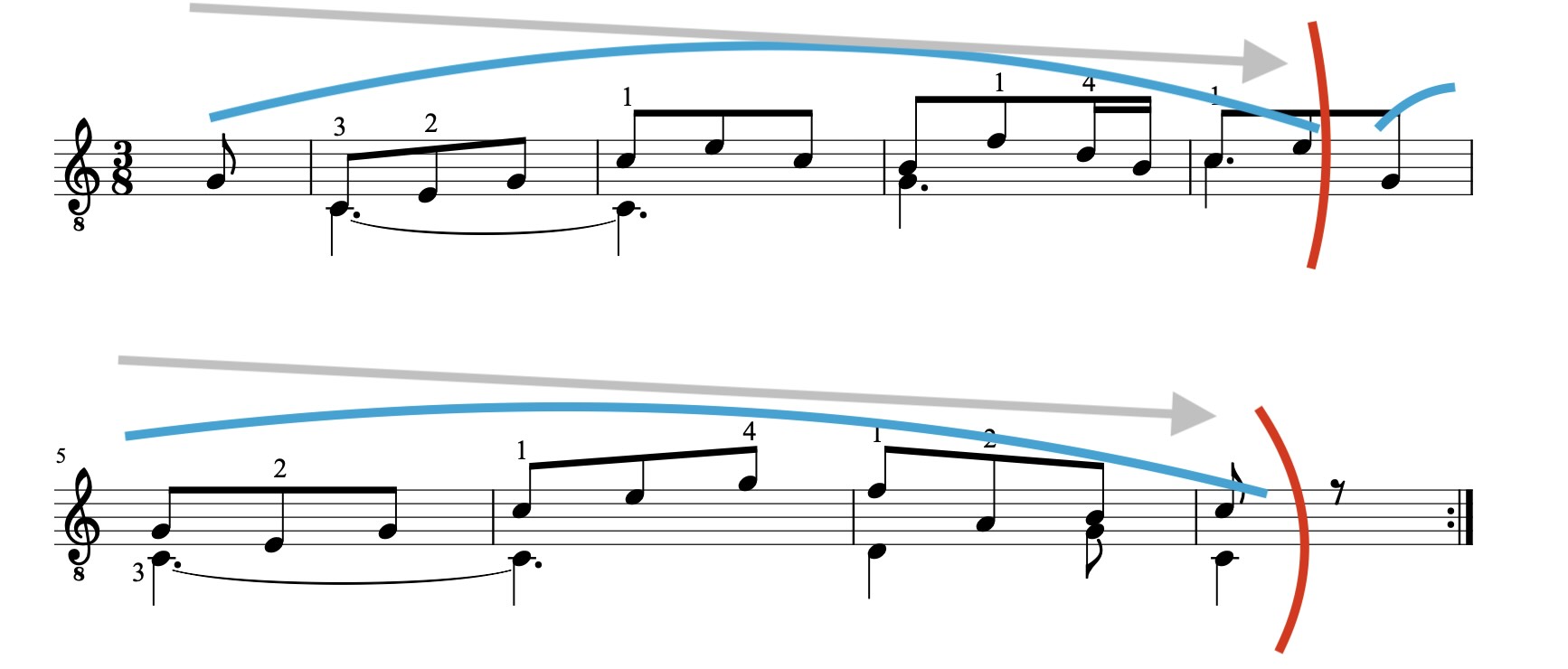 - Mark your phrase destinations to play up to– Decide where your musical destinations are in the piece. If you have a singable line it is usually where you would take a breath. You can mark small phrases or larger ones that are more definitive. But it doesn’t matter too much, even mid-beginners can hear how small musical ideas are formed. Once you have a destination point marked in the score (or by memory), practice playing up to that destination point without breaking rhythm if you make a mistake. Keep it small so it’s an isolated experience you can concentrate on.